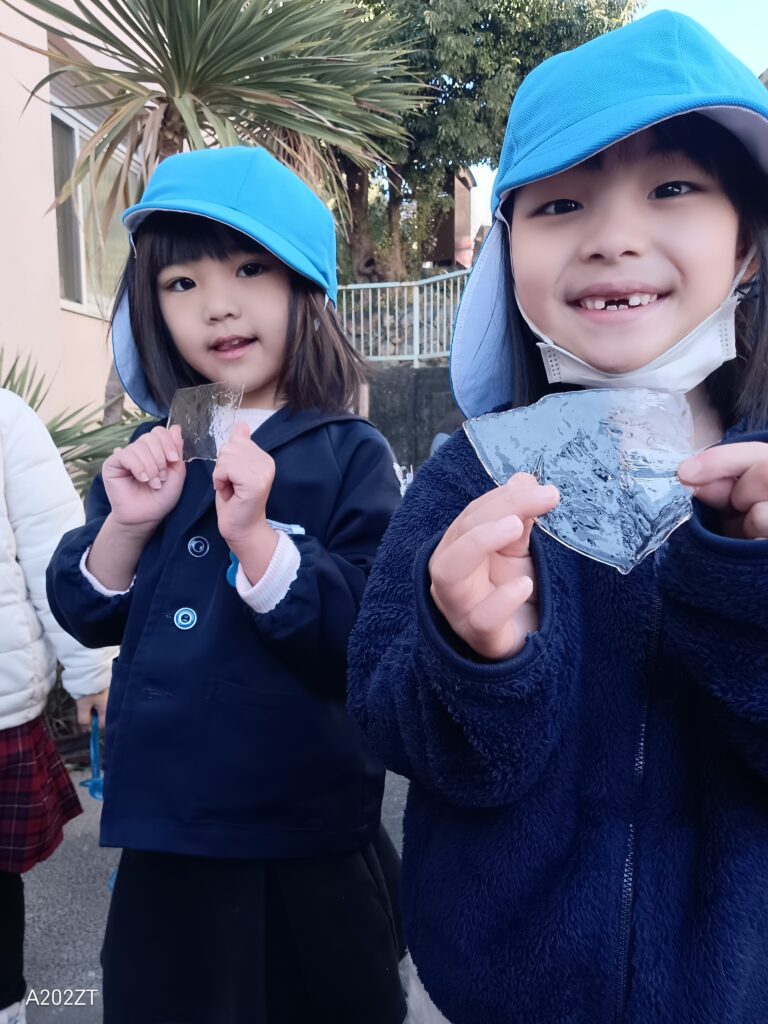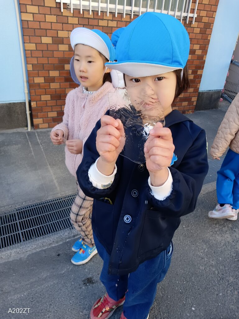 寒い日が続いていますね❄️そんな中でも子ども達は遊びの名人✨先週は朝の冷え込みがとても厳しかったですね。青組(年長組)の子ども達はバケツやおもちゃに水を入れ、氷ができるか観察をしていました。可愛く花びらをいれたり、ビーズをいれてみたり、ドキドキわくわく❤️1日目は・・・「できてない~」「場所がいけないのかな?」「先生どこにおけばいいかな?」など試行錯誤。2日目は・・・「できない~」「明日の方が寒いのかな?待っててみよう」そして3日目・・・ついに❗❗「あぁ~!こおりできてる!!」「みて~!!」とても嬉しかったようで、手が冷たくなるのもおかまいなしで、園内中の皆に見せて回っていました😊